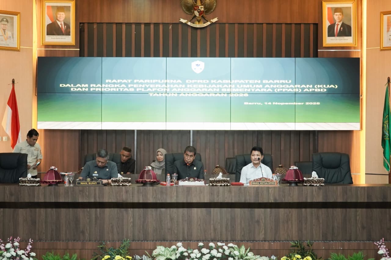 RADARMAKASSAR.ID — DPRD Kabupaten Barru menggelar Rapat Paripurna Penyerahan Kebijakan Umum Anggaran (KUA) dan Prioritas Plafon Anggaran Sementara (PPAS) APBD Tahun Anggaran 2026, Jumat, 14 November 2025, di Ruang Paripurna DPRD Barru, Jl. Sultan Hasanuddin.