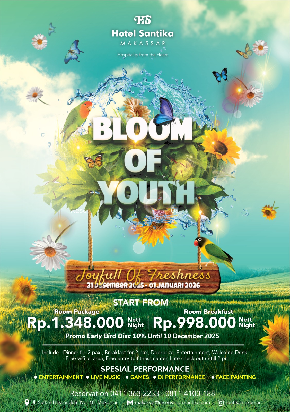 Radarmakassar.id – Hotel Santika Makassar dengan bangga mengumumkan perayaan Tahun Baru yang memukau, bertema “Bloom Of Youth”.