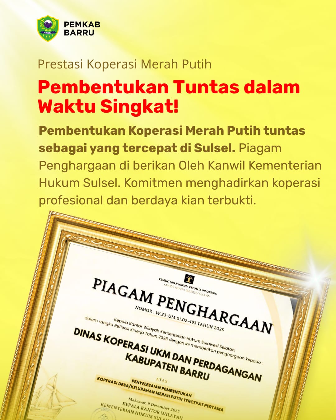 Sebelumnya, Bupati Barru juga menerima penghargaan langsung dari Menteri Desa dan Pembangunan Daerah Tertinggal, Yandri Susanto, atas komitmen dan percepatan pembentukan Koperasi Merah Putih di tingkat desa dan kelurahan. Pengakuan tersebut mempertegas posisi Barru sebagai daerah yang progresif dalam mendukung kebijakan nasional sektor pemberdayaan masyarakat desa.