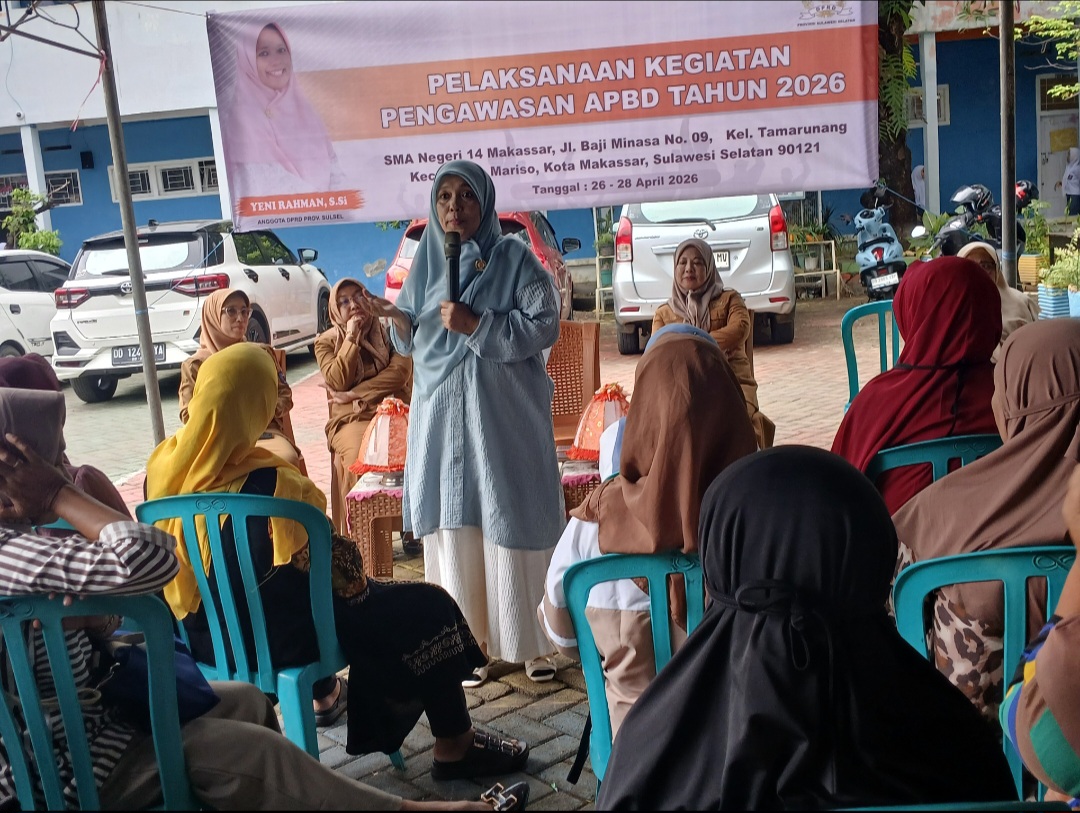 Anggota DPRD Provinsi Sulawesi Selatan Yeni Rahman melaksanaan kegiatan pengawasan APBD Tahun 2026 di SMA Negeri 14 Jalan Baji Minahasa Kel Tamarunang Kecamatan Mariso Kota Makassar Senin 27 April untuk meninjau atau melihat langsung infrastruktur fasilitas pendidikan.